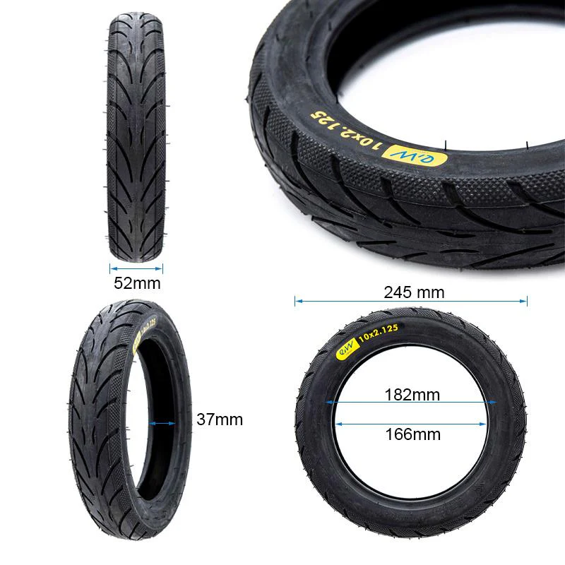 10x2.125-inch tire for electric scooters. Offers a good balance of grip, comfort, and maneuverability. Ideal for urban use, it improves stability compared to narrower tires without compromising agility.