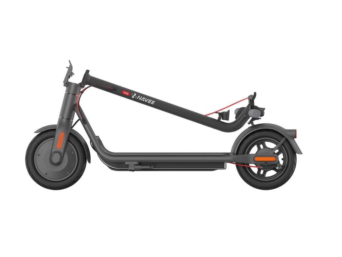 The NAVEE V25 (DGT approved) is a foldable urban electric scooter, ideal for short trips. With a motor of up to 600 W, it reaches speeds of up to 25 km/h, offers up to 25 km of range, is fitted with 10″ tires, and features E‑ABS front and rear drum brakes. Its lightweight steel chassis, 4″ LED display, and IPX5 certification make it safe and comfortable for daily use.
